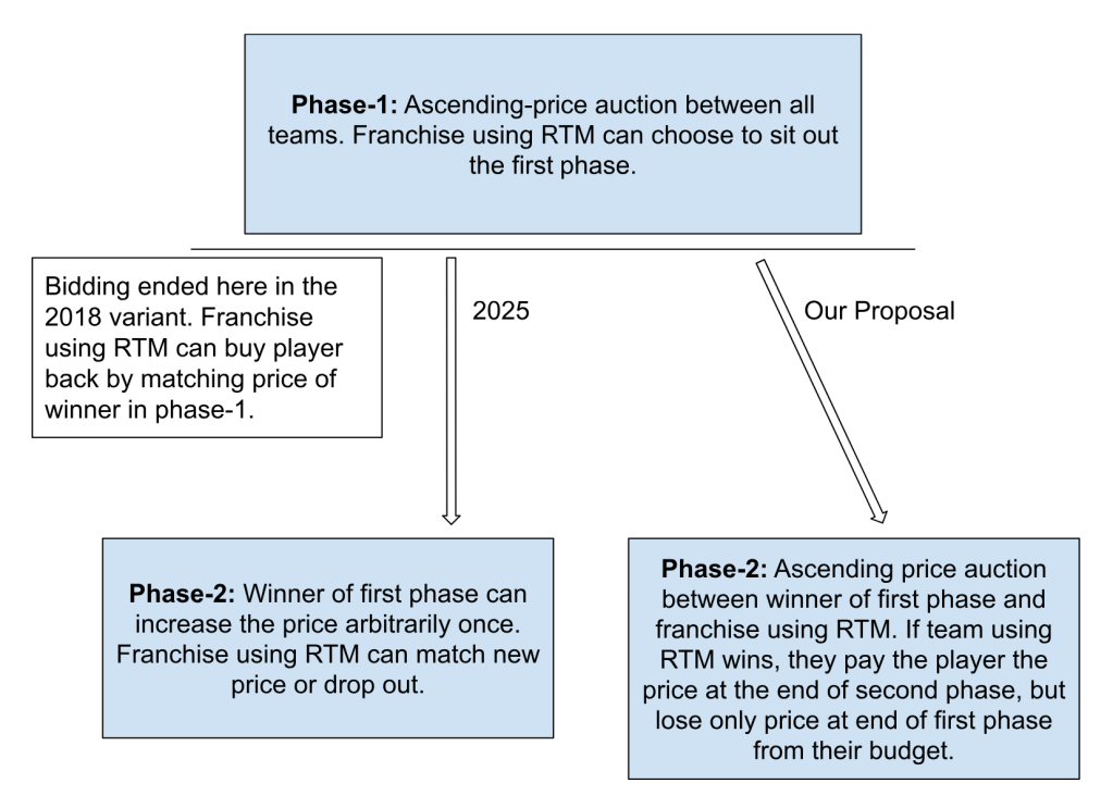 The 2018 version of the RTM allows the franchise to sit the entire bidding process out and match the price at which the auction terminates. The upcoming 2025 version adds a more nuanced second phase on top of the 2018 variant: after the first phase (which also determines a “provisional winner”), if a franchise uses their RTM, the provisional winner from the first phase can raise their bid once. The team using the RTM can either match the new price or forfeit the player. In our proposal, we suggest a different second phase — instead of a one-time price hike, the auction should proceed in an ascending price format as in the first phase between the winner of the first phase and the franchise with the RTM. The player will be paid the price at which the second phase ends. However, if the team with the RTM wins, they will only lose the price at which the first phase ended from their budget.